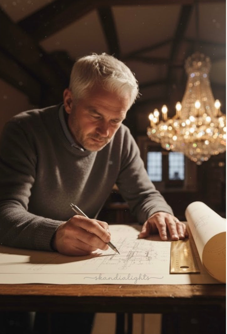 Here, light is imagined, shaped, and refined with quiet precision. On the same wooden tables once used by our father, each concept evolves from a pure idea into an intricate blueprint. Every curve, surface, and reflection of light is studied, balanced, and perfected by hand.