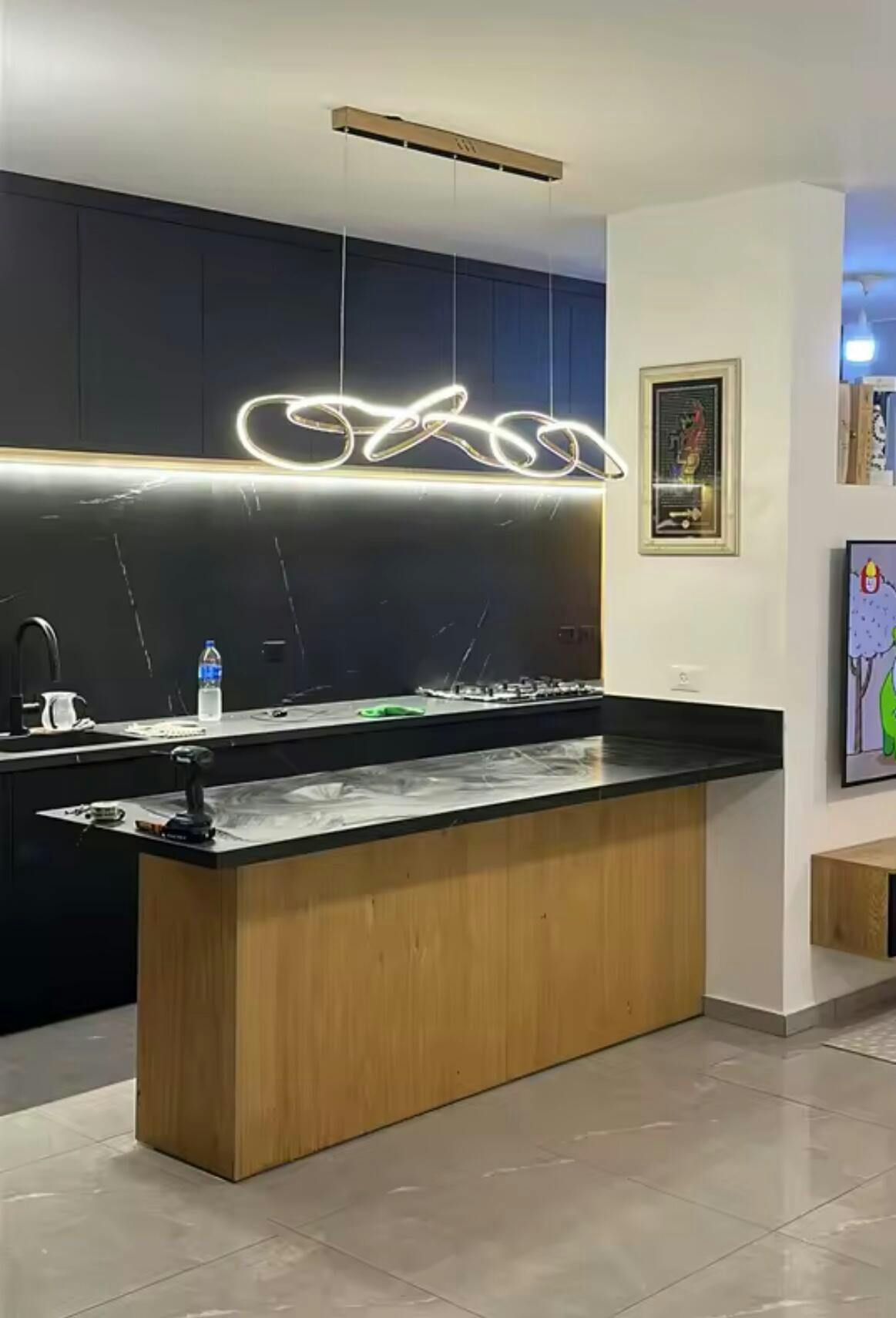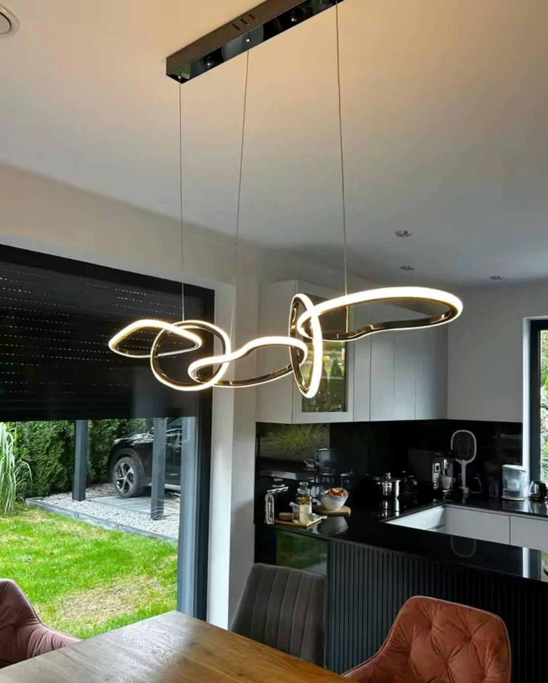 A celebration of continuous movement and light. This fixture features interlocking halos of polished light that appear to float in mid-air. Its minimalist silhouette bridges the gap between functional lighting and kinetic art sculpture.